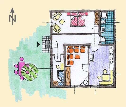 In unserem ca. 70 m² großen Ferienhaus können 4 bis 6 Personen gemütlich wohnen. Die ebenerdige Lage ist für kleine Kinder ideal. Eine Sitzgruppe unter der Birke vor der Wohnung lädt Sie zum Essen im Freien ein.