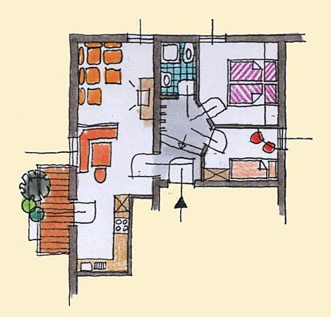 Unsere ca. 50 m² große Ferienwohnung ist für bis zu 4 Personen geeignet. Ein großer, heller Wohnraum mit Balkon nach Westen bietet Gemütlichkeit für Groß und Klein.